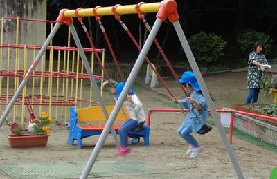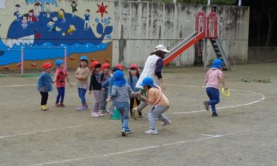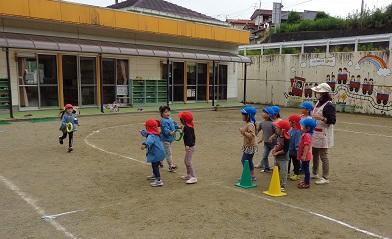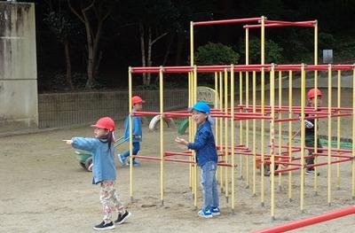 子どもたちは、園庭で自由遊びを楽しんでいました。「だるまさんがころんだ」で遊んでいる子ども、ジャングルジムで遊んでいる子ども、小さなリアカーをひいたりキックボードで遊んでたりする子ども、など様々です。友だちと遊ぶと楽しいですよね。そして、子どもたちはこうした遊びから様々なことを身につけていくのですね。