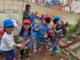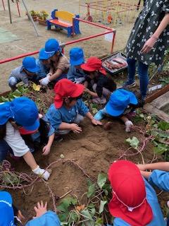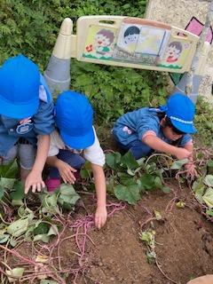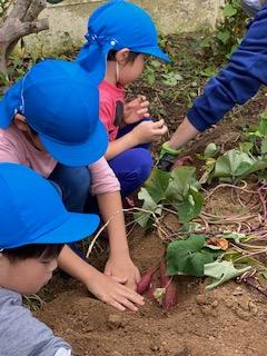 ほし組が中心となって育ててきたサツマイモの収穫をしました。土の中のお芋は大きく育っていて、なかなか掘り出せません。みんな夢中になってお芋を掘っていました。