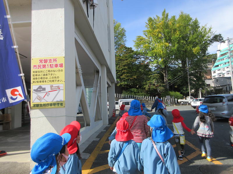 お散歩日和の今日は、温泉神社に園外保育へ出かけました。秋の遠足のチームのペアで手をつなぎ、車に気を付けながら出発。すすきやイチョウなど秋の自然を見つけては、友達との会話を弾ませていました。