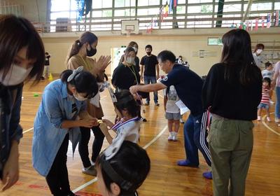 引き続き運動会の様子です。下の写真は親子ダンスの様子です。ミッキーマウスのテーマでダンスをしました。ほのぼのしてとても素敵な雰囲気でした。閉会式では、がんばった24名全員に園長先生からメダルが贈られました。最後に、大きな声で閉会の言葉を言うことができました。保護者の皆さま、本日は、ありがとうございました。おかげで子どもたちにも思い出に残る運動会ができました。