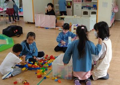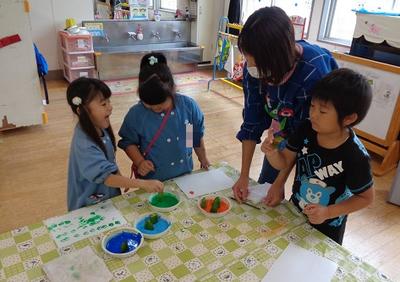 下の写真は活動の様子です。ブロックを使って車を作っている子ども。ピーマンはんこを使って画用紙に模様を作っている子ども。様々な製作活動を通して、豊かな表現力を培っています。