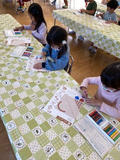 くりやキノコの色塗りをした後、カゴを折り紙で折って「秋の味覚狩り」を楽しみました。