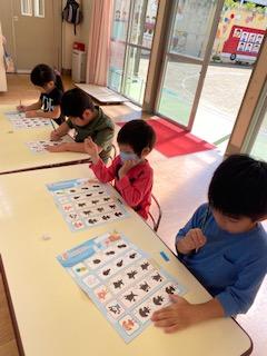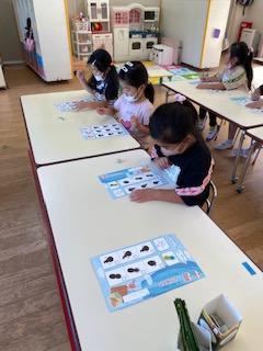 ほし組は、シルエットクイズや数当て、迷路に挑戦しました。鉛筆を使って答えに丸をつけたり、順番を考えて進んで行ったり・・・。みんな集中して取り組んでいました。