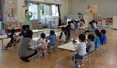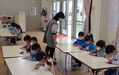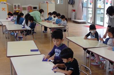 折り紙をしました。担任の先生の話を聞いて一つひとつ丁寧に追っていました。話の聞き方が上手で感心しました。折り紙は、手先の練習にもなり脳も活性化されると言われます。折り紙のよさに多く触れてほしいと考えています。