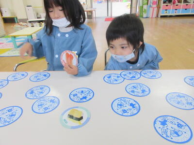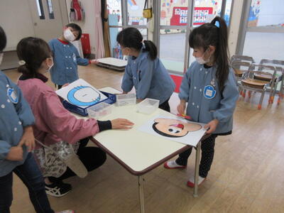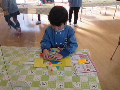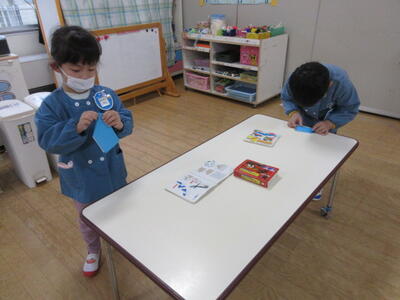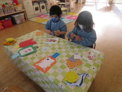 ひよこ組は、千代紙をちぎって製作に取り組んでいました。