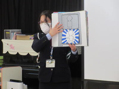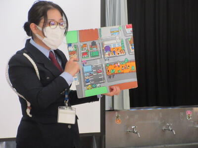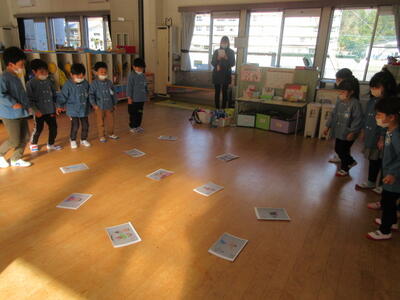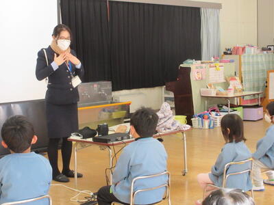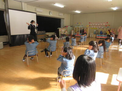 避難訓練では、不審者対応訓練をしました。先生たちのいつもとは違う真剣な様子や声色に気づき、静かに指示に従って避難行動をとることができました。