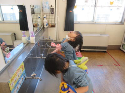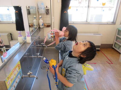 戸外遊びの後は、しっかりとガラガラうがいをしていました。とっても上手にできていましたよ。