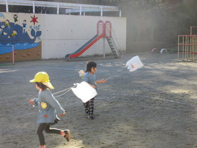 今日は、登園後すぐに凧揚げ遊びを楽しんでいました。