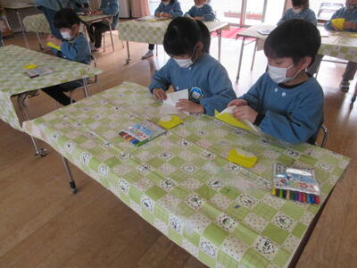 園庭が凍み解けてぬかるむようになってきたため、登園後すぐに園庭へでて縄跳びや鬼ごっこを楽しみました。室内に入ってからは、それぞれの学年での活動を楽しんでいました。