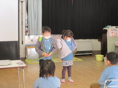 冬休みが終わり、いよいよ3学期が始まりました。幼稚園で友達に会えることを楽しみにしていた子が多く、全員が始業式に参加することができました。