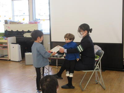 DVDで道路のお約束の話を観た後、交通教室の修了証書をケンちゃんと指導員の先生からいただきました。