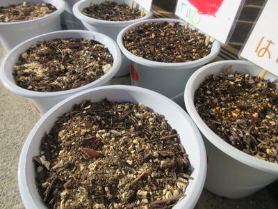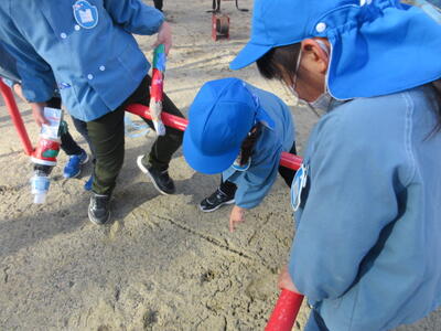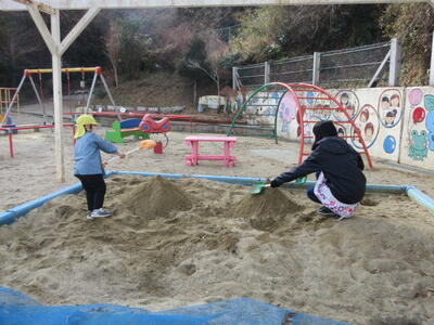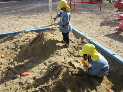 ひよこ組は、友達と一緒に砂遊びを楽しんでいました。大きい山づくりや、ごちそう作りを楽しんでいます。