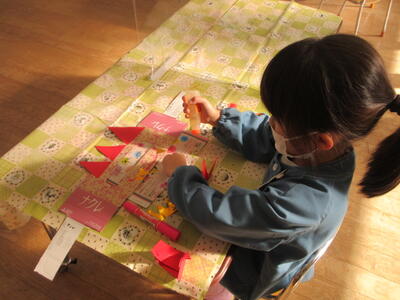 ほし組さんは、冬休みの思い出をみんなの前で伝えたり、思い出を絵札に書いてカルタ作りをしたりしました。カルタ遊びが楽しみですね。