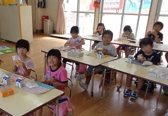 子どもたちは、今日も元気に登園しました。下の写真は、昼食の様子です。ハンバーガーやチョコパンを食べていました。おいしいものを食べている笑顔は最高ですね。