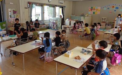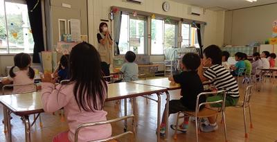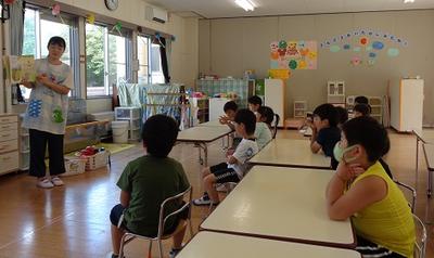 昼食後に本の読み聞かせがありました。今日は、教育実習生の先生が本を読んでくれました。本の題名は「また ぶなのたね」(著:佐々木マキ)でした。子どもたちは真剣に聞いていました。