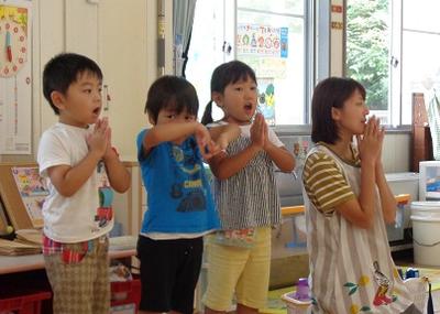 9月26日の運動会に向けて、準備が着々と進んでいます。園舎内に運動会の看板が置かれていました。下の写真は、ごちそうさまの様子です。今日の係の3人が元気にあいさつをしました。明日は、レモンチームが当番になります。よろしくお願いしますね。