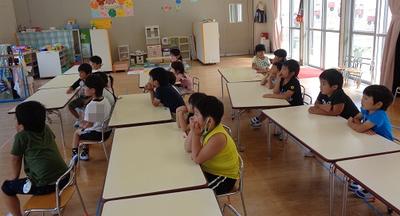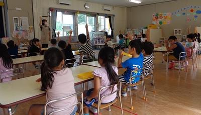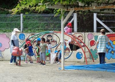下の写真は、遊具で遊んでいる様子です。とても楽しそうです。その後、子どもたちは、園舎内で活動しました。担任の先生からクイズが出されました。「第一ヒント。それは耳が2つあります。」「第2ヒント。耳の色は黒いです。」などのクイズでした。子どもたちは真剣に聞いてクイズに答えていました。手の挙げ方が上手が子どもが多く、感心しました。