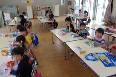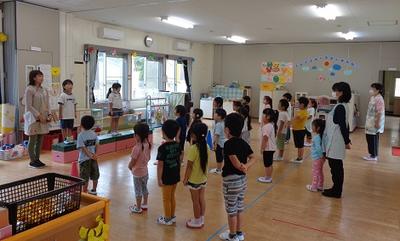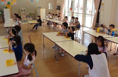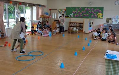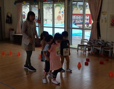 外はあいにくの雨だったため、運動会の練習は園舎内で行われました。先日行った予行練習の反省を生かし、閉会式の練習をしました。しっかり声を揃えて終わりの言葉を言うことができました。その後、親子競技の練習をしました。子どもたちは、歩きながら競技の動きを確認しました。