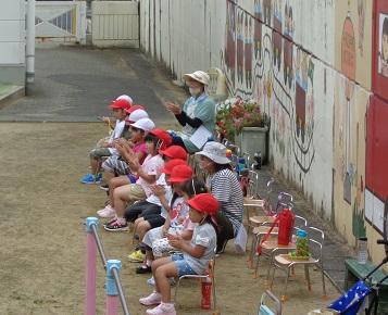 ほし組さんのバルーンの演技を応援しているばら組さんの様子です。