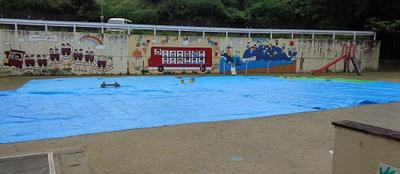 26日(土)に運動会が予定されています。今日、明日と降雨の可能性があるので園庭にブルーシートを敷きました。これで、「天気はいいけどグランドが悪くてできない」という状況は避けられそうです。