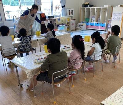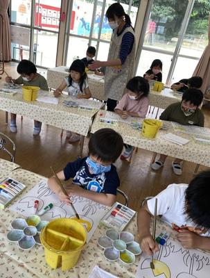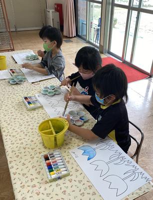 今までは、園の絵の具を共用していましたが、ほし組からは個人持ちになったので、使える日が待ち遠しかった子どもたち。先生の話をしっかり聞いて絵の具あそびを楽しんでいました