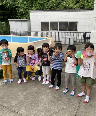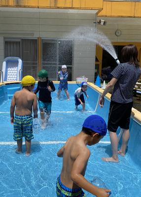 今年度は、新型コロナウィルス感染症予防のため、少人数で入れ替えをしながらの水遊びですが、子どもたちは大喜びで手作りのおもちゃのジョウロを使い、プールでの水遊びを楽しみました