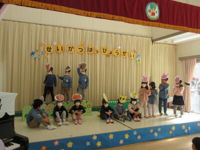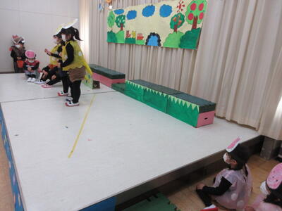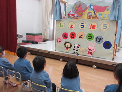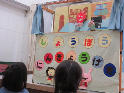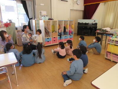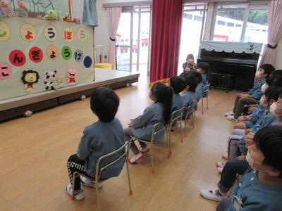今年度の言語劇は、ひよこ組さんとほし組さんが一緒に演じています。ほし組さんが真剣に取り組む姿をみて、ひよこ組さんも発表会のイメージがもてるようになってきました。