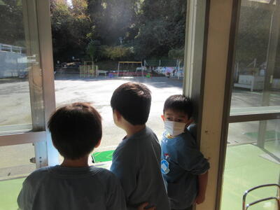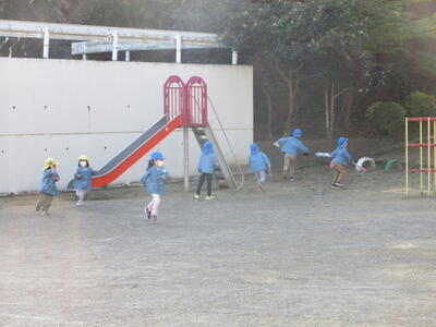 今日は避難訓練がありました。今回は自由遊び中の近隣で火災が発生した想定の訓練です。事前に知らせることなく、拡声機のサイレンで合図をしましたが、子どもたちは担任の先生の指示を落ち着いて聞いて行動することができました。
