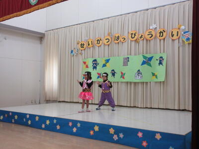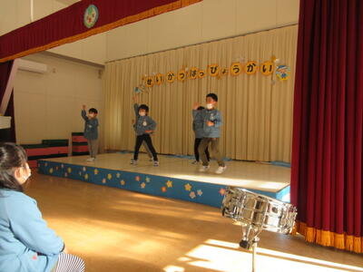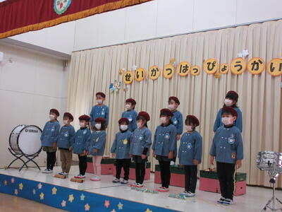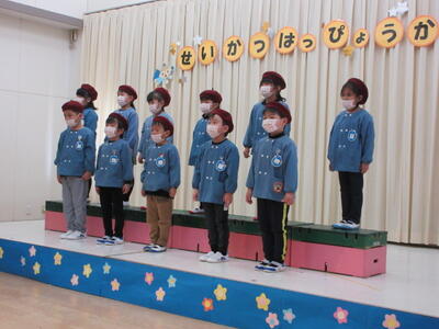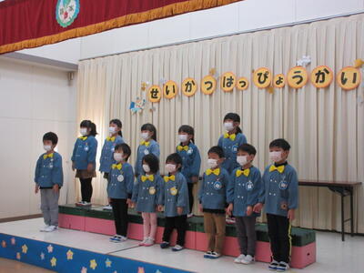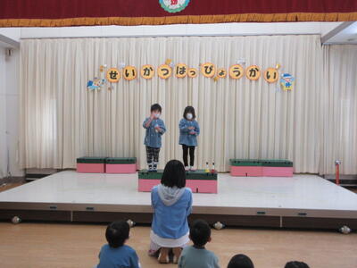 天気にも恵まれ、今日は生活発表会が行われました。予行とはまた違う雰囲気の中、意気込みが感じられる子、ちょっと緊張している子、嬉しくて早く始めたい子など、様々な表情を見せながら登園し、発表会の始まりを待っていた子どもたち。いつもとは違う会場の雰囲気にちょっと驚いた様子を見せましたが、今までの取り組みで積み上げた自信がぐっと勇気をくれ、大きな声であいさつすることができました。