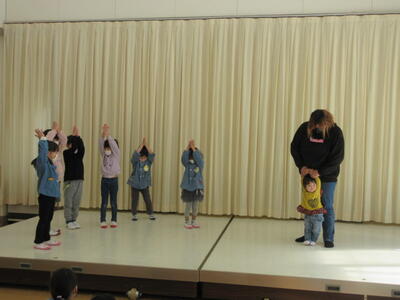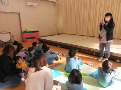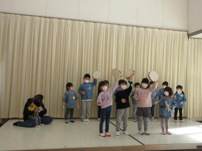 今日のお楽しみは、発表会ごっこでした。未就園児のお友達も一緒に舞台に上がって、踊ったり、鈴やタンバリン、カスタネットなどの楽器を使って、楽器遊びを楽しみましたよ。