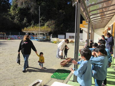 「また遊びに来てね~」と見送る園児たちの様子です。
