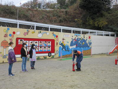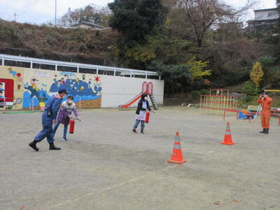 園児たちの避難訓練の後は、職員の消火訓練です。