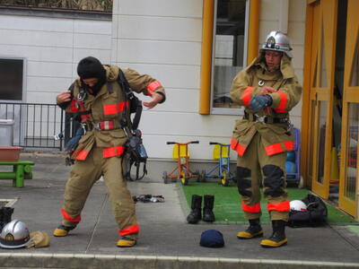 訓練後、消防士さんが防火衣と着替えを特別に見せてくださいました。