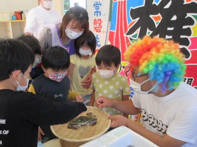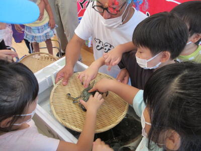 紙芝居を見た後は、上野台豊商店さんが持ってきてくれた活魚を触ってみました。