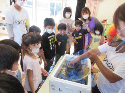 「タコの足は何本あるか数えてみようか、1、2,3・・・」「ほんとに8本ある~」