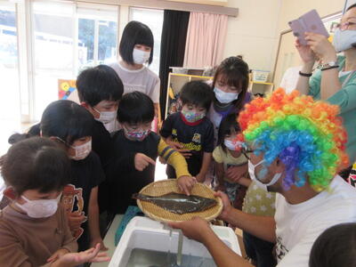 実際に生きた魚たちに触れたことで、肌触りや魚の動き、においなど、五感を通していろいろな発見をして友達と話していた子どもたち。とても貴重な体験をさせていただきました。