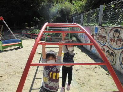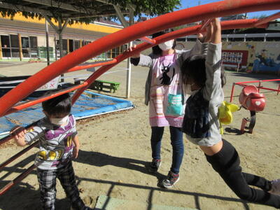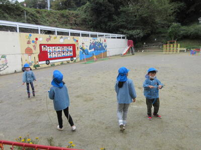 今朝はぐっと気温が下がって冷え込みましたね。だんだん秋が深まってきています。日中は、日差しの中、縄跳び遊びや太鼓橋など体を使った戸外遊びを楽しみました。