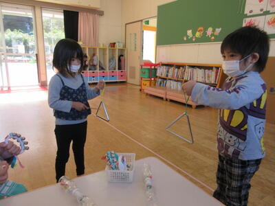 ひよこ組は、音楽に合わせて楽器遊びを楽しんでいました。