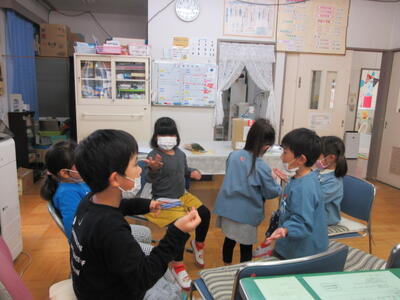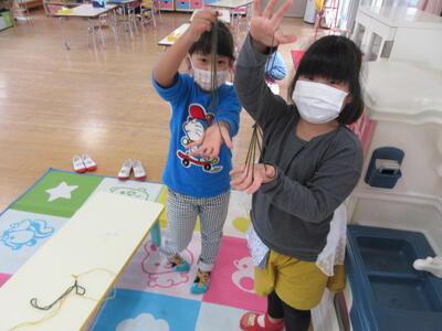 あやとりに興味が出ていたほし組さん、できた形を職員室まで見せに来てくれました。そのまま、あやとり教室が始まりました。友達同士でも教えあう姿が見られるようになっています。