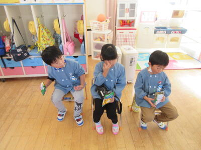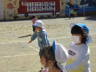ほし組さん、毎日縄跳びに取り組んでいます。挑戦することで、少しずつ跳べる回数が増え、意欲がわいてきたようです。