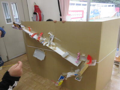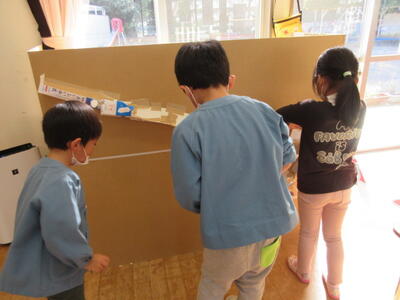 室内では、どんぐりのピタゴラスイッチ装置作りが始まりました。