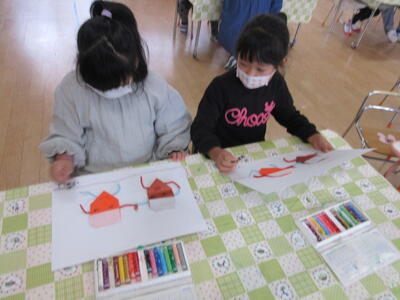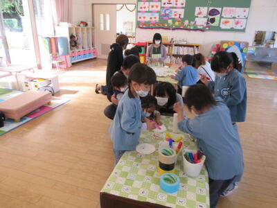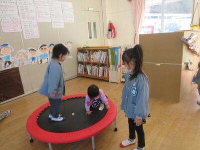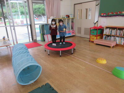 雨が降って肌寒い一日でしたね。今日は、室内で製作遊びやアスレチック遊び、体操などを楽しんでいました。