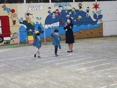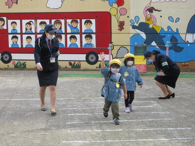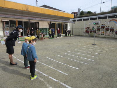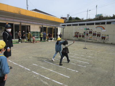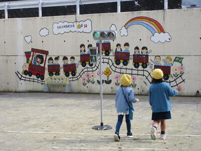園庭に簡易信号機を設置してもらい、最初は園児だけで渡ってみました。おうちの人にもルールを守って渡れるか見てもらいましたよ。