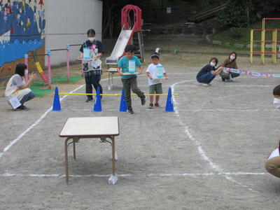 係や、ことばも自分たちで考えて、ミニ運動会の始まりです。進行もいましたよ。