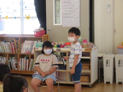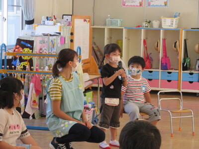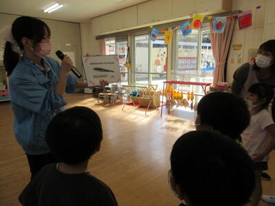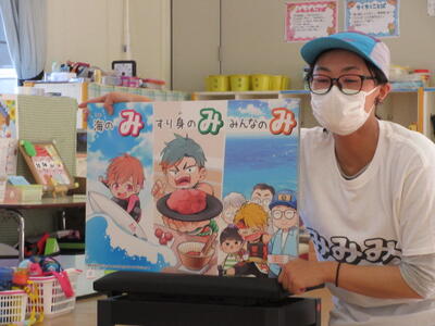 「今日は3つの”み”のお話をするよ!みんなが知っているうみの生き物はいるかな?」「うに!」「まぐろ!」