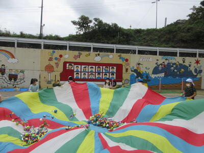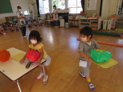 「ひよこ組さんもバルーンに挑戦!上手に一緒にできたね!」