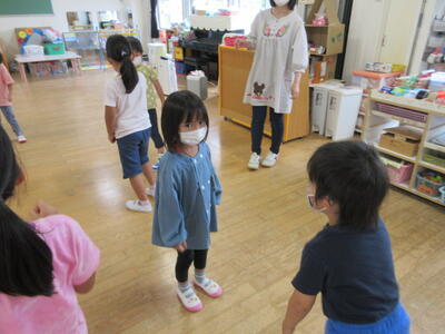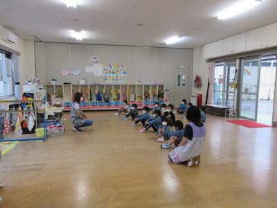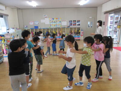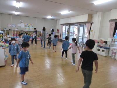 おさかな教室で楽しむポーポー焼きのダンスやジャンケン列車遊びは2クラスで一緒に楽しみましたよ。