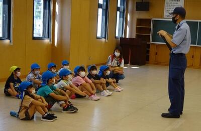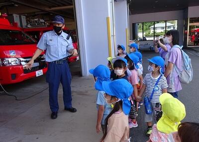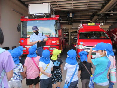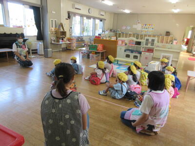 晴天のもと、秋の遠足が行われました。行き先は、常磐消防署です。朝、全員がそろったので園内で今日の遠足のお話を聞きました。みんな聞き方が上手です。