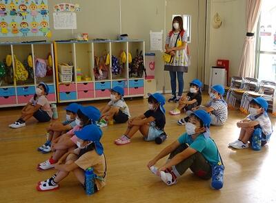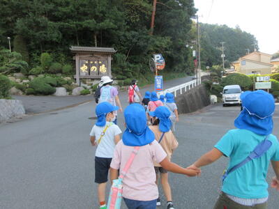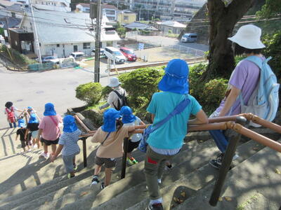 ほし組は暑さにも負けず、どんぐりを拾ったり、歌をうたったりしながら約3Kmの道のりを歩ききることができ、子どもたちの成長を感じました。頑張りましたね!