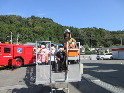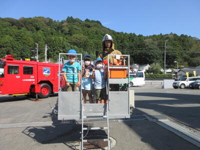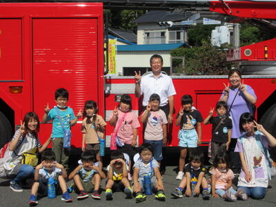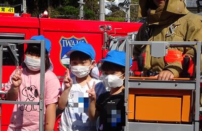 途中、ひよこ組さんも合流し、常磐消防署へ一緒に手をつないで向かいましたよ。